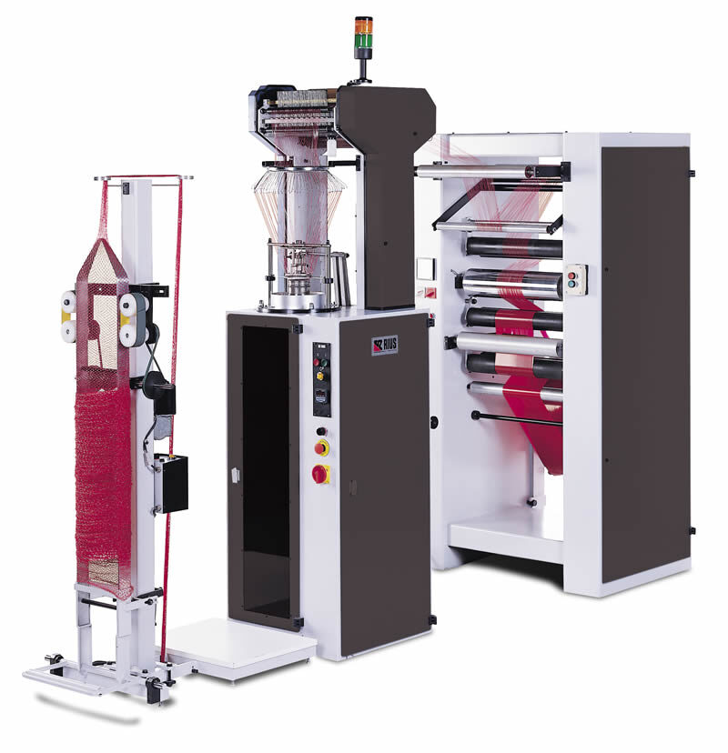 Máquina circular, para la producción de malla tubular para el embalaje de frutas y vegetales, con alimentación directa a partir de film de polietileno de alta densidad.